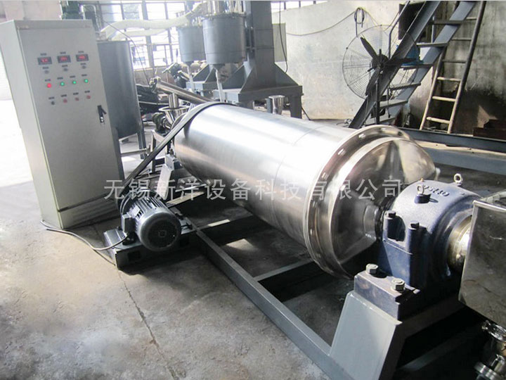 工作原理:本機為臥式筒形旋轉裝置,外沿齒輪、鏈輪或皮帶傳動,兩倉格子型球麻機。