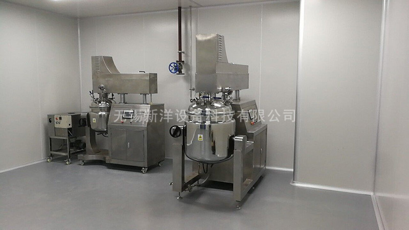 物料在水鍋、油鍋內通過加熱、攪拌進行混合反應后,由真空泵吸入乳化鍋,通過乳化鍋內上部的中心攪拌、聚四氟乙烯刮板始終迎合攪拌鍋形體,掃凈掛壁粘料,使被刮取的物料不斷產生新界面,再經過葉片的剪斷、壓縮、折疊,使其攪拌、混合而向下流往鍋體下方的均質器處,物料再通過高速旋轉的切割輪與固定的切割套之間所產生的強力的剪斷、沖擊、亂流等過程,物料在剪切縫中被切割,迅速破碎成200um-0.2um的微粒,由于乳化鍋內處于真空狀態,物料在攪拌過程中產生的氣泡被及時抽走。采用抽真空的方式,使所生產的制品在攪拌過程中不再混入氣泡,從而保證可制造出富有光澤、細膩及延展性良好的產品。